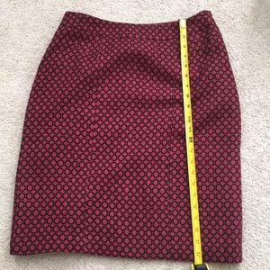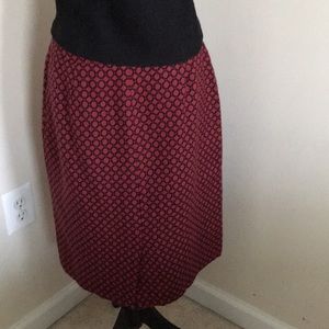 Cute burgundy and black pencil skirt with circle designs all over. Worn only a few times. In Excellent Used Condition Split in the back. The skirt comes just below the knee great for work!