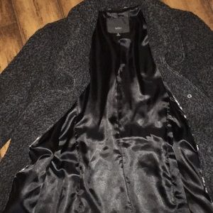 GUC Wool/polyester blend (47% wool) dark black and gray color. Texture is raised. Fully lined button down. I wear L/XL, 14/16 and it’s snug. Material is fuzzy but not scratchy. I would keep except it doesn’t fit and I have way too many coats.