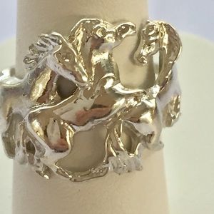NWT Sterling silver .925 ring which I call "Wild Horses" after the song by The Rolling Stones. This ring was handmade by me and cast by me in my studio, no lead or tin fillers used. High quality and made to last. I have also rhodium plated the sterling silver which gives it a very bright finish. The 3 horses travel 3/4 of the way around the ring. I can size it up or down within 2 sizes without affecting the design. Wear on any finger. Weighs 7 grams on my scales.