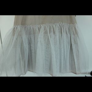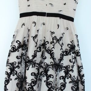 Adrianna Papell brocade strapless formal dress. Size 8. Gorgeous , delicate and detailed dress. Champagne lace with elegant black brocade. Delicate velvet ribbon accent on chest line. Has a tulle skirt and bra cups inserts. Can be worn strapless or with straps (not included). Only worn once for a few hours impeccable like new.