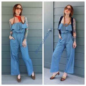 Urban Outfitters Lucca Couture Strapless Chambray Jumpsuit Chambray all day in this strapless ruffle-top jumpsuit by Lucca Couture. In a relaxed culotte-leg fit that pulls on with ease featuring stretch-banding at the waist + top and pockets at the sides. Content + Care - Lyocell - Machine wash - Imported Size + Fit - Model is 5'10" and wearing size Small - Measurements taken from size Medium - Chest: 33" - Waist: 29" - Rise: 12. 5" - Inseam: 26" - Leg opening: 11" NWT