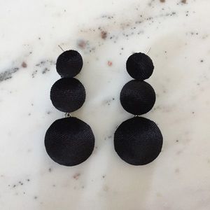 Lightweight & 60s inspired, the "Lizzie" bon bon triple ball drop earrings are ideal for weddings, prom, or a holiday soirée! With their dangling spheres, these retro oversized statement earrings are both bold & dainty. Black faux-velvet fabric covers three circles of increasing size. The metal is silver colored zinc alloy. They are stud earrings with rubber backs. New with protective packaging. Available in additional colors in separate listings.