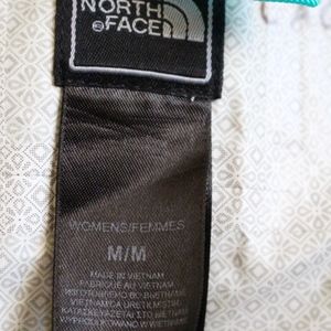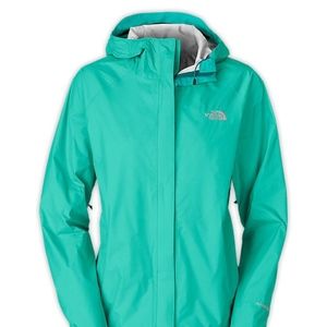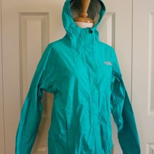 Lightly worn women's teal rain coat made by The North Face. Size Medium. Light wear and tear, small mark on left arm.