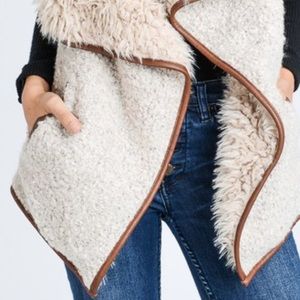 Featuring a beige ivory colored fur and shearling vest with faux leather trim, side pockets and oversized collar. Super soft and warm. Sits open. Sleeveless.