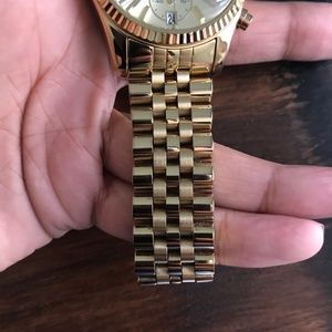 Slightly used authentic Michael Kors MK5556 Lexington Gold-Tone Chronograph Date Women's watch. Comes with original box, warranty booklet, and extra links. Overall, in excellent condition, no scratches on the watch face. There is some slight wear on the band (shown in picture).