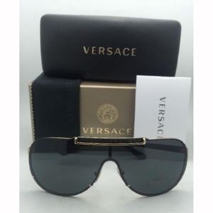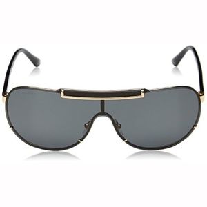 Gold & Black Shield metal frame with VERSACE logos on the sides of the temples that features Grey lenses with 100% maximum UV protection.