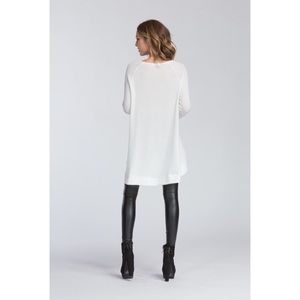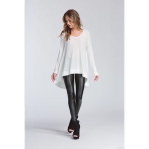Loose fit, scoop V-neck, long sleeve hi-low raglan top. Sleeves are banded. Has waistband. This top is made with medium weight, brushed low gage sweater knit fabric that has a very soft fuzzy texture, drapes well, stretches well, and is warm.