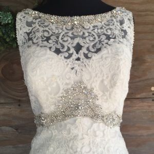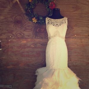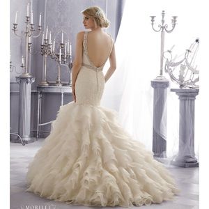 Stunning ivory lace trumpet gown by Morilee Bridal. Has sheer lace boatneck the connects to a low and open deep vback. Raw cut organza tiered skirt with small train. Has button and loop finish over back zipper. Pearl and crystal detailing along straps and waistline. Unaltered.