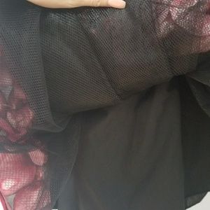 It is a NEW full Apple skirt with 2 layers of black tulle on the inside which peaks out a bit at the bottom. It also has a a black slip under it all...the zipper works ok you have to toggle it a bit because of all the material but it will go up. The red is also a little deeper than the picture.It sits at the waist with a band of the same material. It hits right below the knee on a person 5'3. Size 0-2. It has no stains or worn spots.It's a perfect skirt for any fun outfit!