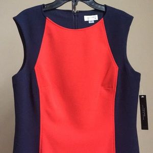 Beautiful sleeveless colorblock crepe sheath dress from Tahari. Lined. Shell 97% Polyester, 3% Elastane. Lining 94% Polyester, 6% Elastane.