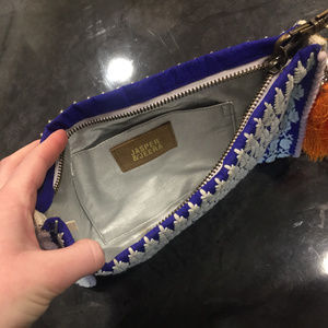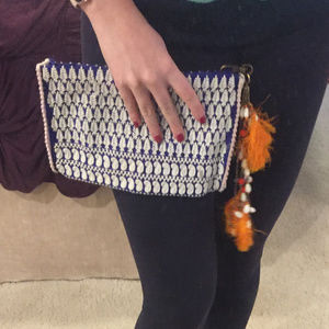 Jasper & Jeera Clutch from Anthropology! Barely used at all! I love this stylish clutch, it's a great pop of color for any outfit! I bought it a year ago and, unfortunately, do not carry clutches often so it's gotten very little use from me. Fortunately for you, it's gotten very little use from me and is practically new! Also, the entire chain of fringe does clip off of the clutch if you would like!