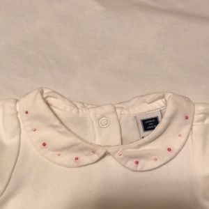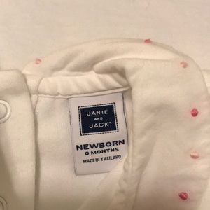 Cute!! Cute! Cute! The white onesie has a light pink polka dot embroidery along the scalloped neckline. Janie and Jack size newborn! 💕