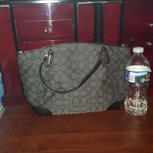 This is a super cute and fun sized Coach bag perfect for the on-the-go woman or someone who likes a small bag this has been gently used with almost no sign of wear it has been stored in a pet and smoke-free home it has really nice metal embellishments on the handles that also say coach I showed a picture with a water bottle to show size and one on my arm.