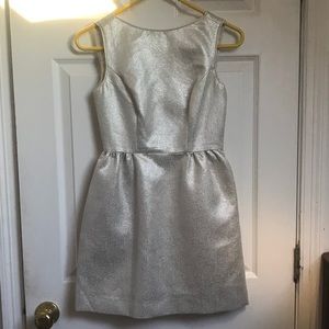 Beautiful metallic dress with gorgeous open/bow detailing on the back. Wore this once to a wedding, so it is in great condition. I had it hemmed and taken up at the shoulder, so it fits like a 0p