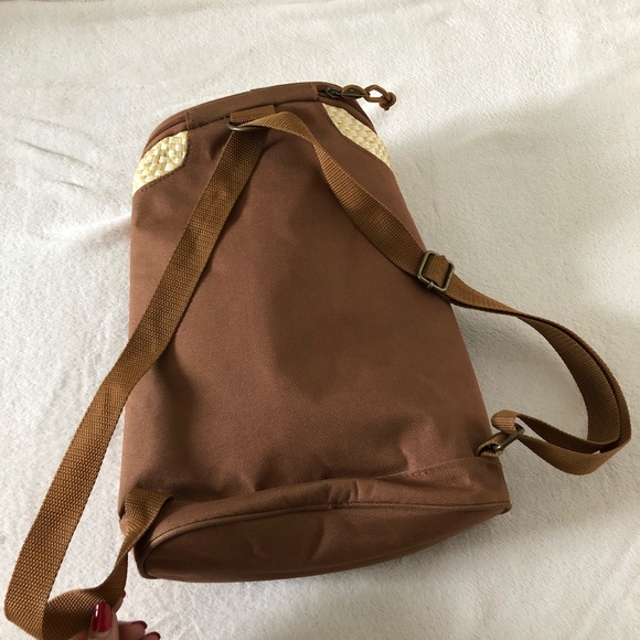 Brown Woven Lunchbox Backpack, yellow and white woven material, brand new never used, front zipper pocket, top big zipper compartment, adjustable strap