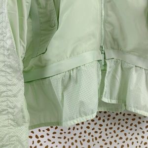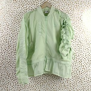 So many details! Sleeves can be worn down or scrunched up. Cute mesh peplum ruffle. Pockets at waist and one chest.