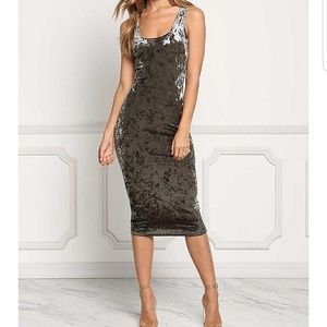 A gorgeous Emerald Green bodycon midi dress featuring a lustrous, crushed velvet bodice. Sleeveless with a deep scoop neckline and deep scoop back. Has a form hugging silhouette that looks amazing on!