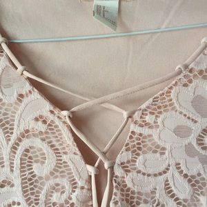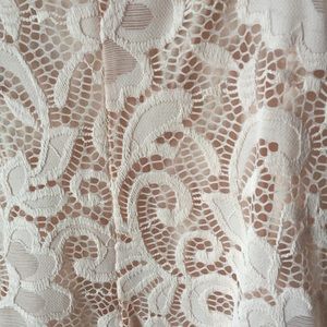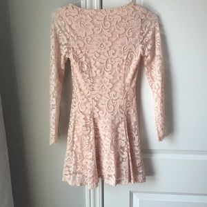 NWOT beautiful blush lace lined dress. Color is well shown in the first picture. Not see through because it’s lined. Color is all the same. Fits very nice. Best fits xs/s. Doesn’t stretch. Fingertip length. I also have one in white I’m selling if you scroll through my closet(: only worn for 2hrs. No flaws.
