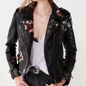 Only worn once! Hurts me to part ways with it, but I won’t get to wear it for a good while. Silver studded detail along the cuffs and down the back. Floral embroidery all over the black faux leather, perfect for this time of the year. Retails for $168 (plus tax depending where you’re from). Serious inquiries only please! Price is firm :)