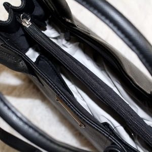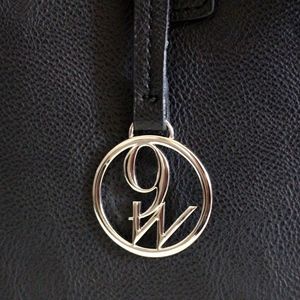 INCLUDES: two main compartments separated by a zippered compartment, small zippered pocket inside, two open pockets inside, removable Nine West charm
