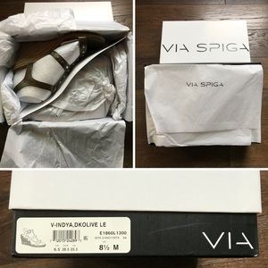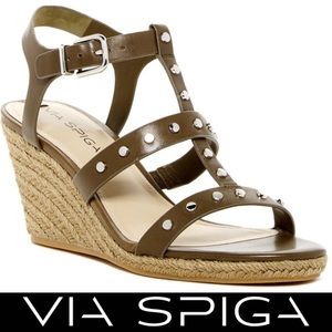 Brand new in Box, never been tried on! Chic wedge sandals by Via Spiga. Edgy studs on the dark olive leather. Ankle straps. Retails for $185.