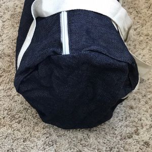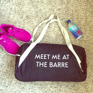 NWOT denim gym/ barre class bag. Perfect for toting all of your essentials to the gym or your favorite workout class! Never used, in brand new condition. Able to hold a change of clothes, shoes, towel, water, and everything you need, complete with zip side pocket for your phone or wallet 👟🏆 A cute way to travel to/from your workout ✨