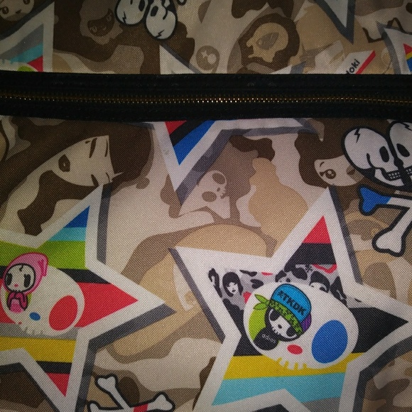 Gently used twice, Tokidoki Messenger Bag with Skulls & Star Pattern. Measures Approx.: 15.5"L X 12"H X 3"W X 22.5"SD. There is 1 zipper pocket on the front one huge main zipper pocket and one non zipper pocket on the back inside has black lining with hearts and crossbones. Very cute and unique! Great for school or carrying your laptop. No holes or flaws!