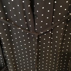 Black with light tan polka dots. Shirt dress so it’s cut to look like an oversized dress shirt. Thin tie at waist. I only wore it once...it’s just too short for me...falls to about mid-thigh. Size XS.