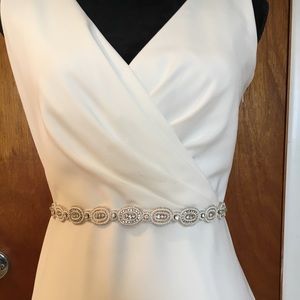 Beautiful, classic gown! BHLDN Livia dress by Badgley Mischa. Size 4. Ivory. Altered for 5’0” bride wearing 3.25” heels. (approx 54” length laying flat) Also had back drape re-made, as seen in wedding pictures. No other alterations to gown. Worn twice. Bustle & small train. Hand washed hem after outdoor wedding, any markings are hardly noticeable. Belt not included, but do have 2 belts if interested.