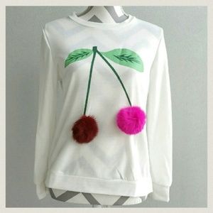 Pretty please with a cherry on top" long sleeved top. So playful fun this top features faux fur pom pom cherries with leaves/stem decal. Pair with jeans and booties or will shorts and knee high boots.