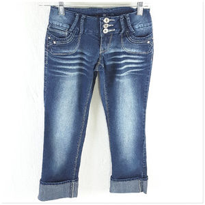 ANGELES, Denim Jeans, size 0 See Measurements, triple exposed button waistband, embroidered back pockets, front double belt loops, 3” cuffed hemline, whiskering, faded distressed multi-colored wash styles, machine washable, medium-weight stretchy denim material, 55% ramie, 23% cotton, 20% polyester, 2% spandex, approximate measurements: 13” waist laying flat, 2” waistband, 23” inseam, 5.5” rise, 2” zipper. SAVE BIG! AUTOMATIC 30% BUNDLE DISCOUNT! ADD TO A BUNDLE!