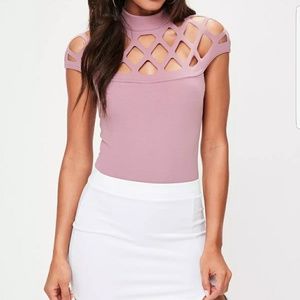 Stunning bodysuit with a high neck, lattice style lazer cut detailing and a crepe finish. Stretchy fit featuring a concealed back zipper and thong bottom with snap button closure. Also available in Black.