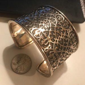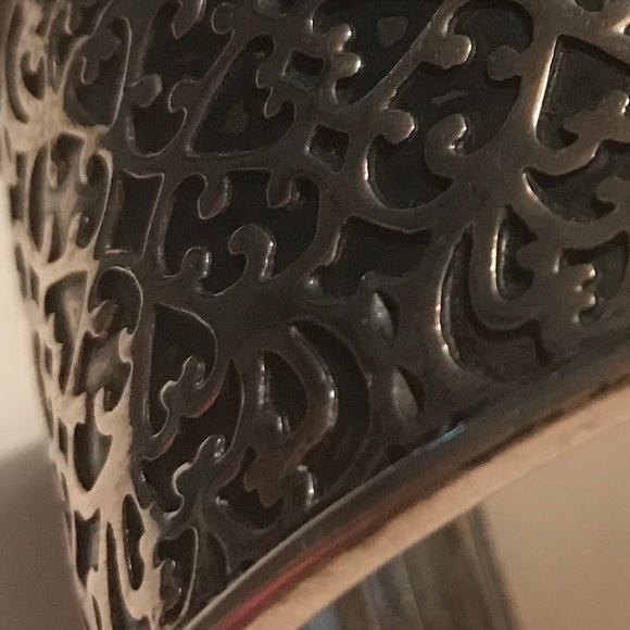 Beautiful. Substantial. Handmade by artisans. Approximately 1 3/4"wide Oxidized treatment of underlay enhances intricate scrollwork (can be highly polished if desired).