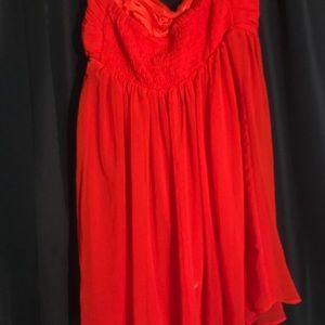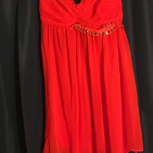 This dress has never been worn. I purchased it and upon trying one realized the lining was too short, slinky, and just of bad quality. I removed the existing lining and sewed in a more elegant, satin lining. The dress itself is very beautiful. It boasts a sweetheart neckline, no jewels missing, and is about 3 in from the knee (I’m 5’4”). The back is stretchy, so could fit several sizes from L-XL