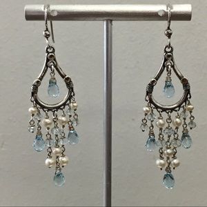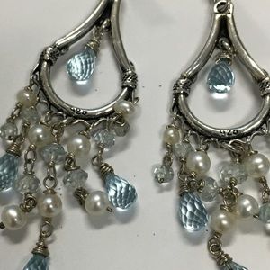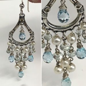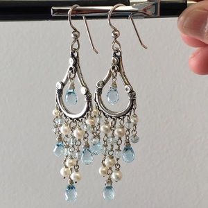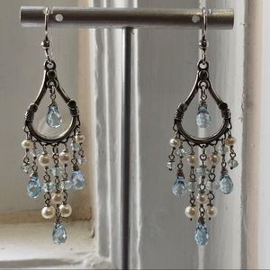Stunning handmade aquamarine and pearl chandelier earrings in sterling silver. The gorgeous wire-wrapped aquamarine briolettes and rondelles catch the light beautifully, and the creamy white pearls have a soft luster and silver overtones. French hooks. Measures approx. 2.75” from top of ear wire. Marked “925”. These showpiece earrings have a romantic, vintage look; which is enhanced by the tarnishing of the silver. Portions of the silver have a gold undertone.