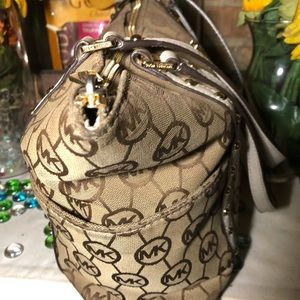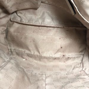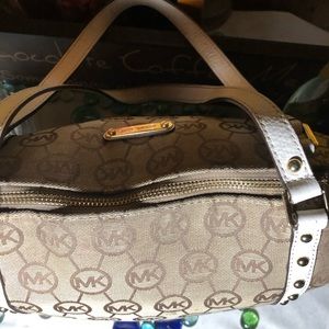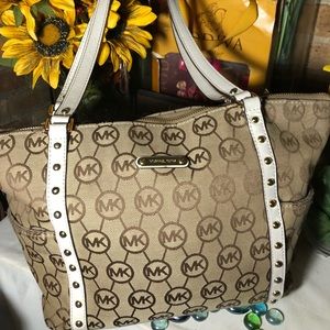 00% authentic MK Bag- Sz 10x16- good condition- canvass material- white leather trim- light stains inside not bad at all- very nice bag.