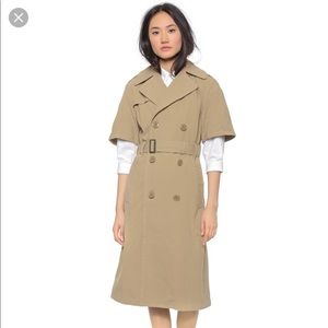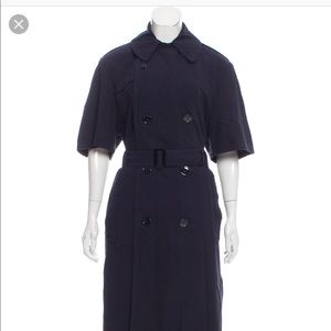 A voluminous, double-breasted NLST trench coat. Welt pockets frame the button placket. An optional buckle belt cinches the waist. Epaulets accent the shoulders. Short sleeves. Unlined.