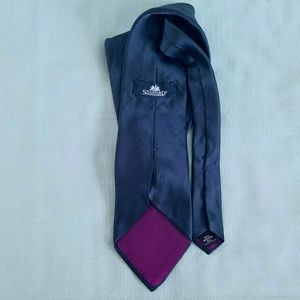 100% imported silk. Made in U.S.A. Solid dark/navy blue. In good condition, with the exception of one small stain (see last photo). Never tried to remove it.