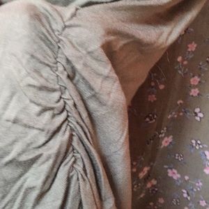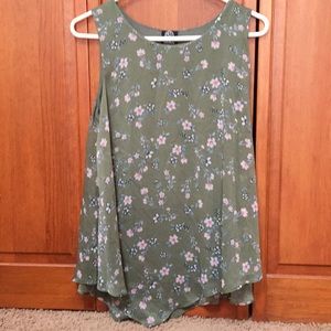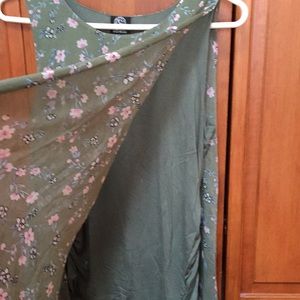 Celery green with soft pink and baby blue flowers. Chiffon overlay is open on one side to show under layer which has ruching on the sides. Fun and sexy! 19 inches p to p and the under layer is about 22 inches.