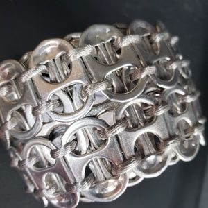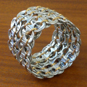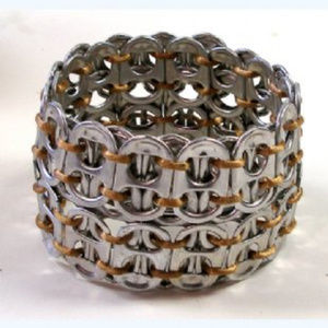Reduce Reuse and Recycle - Bracelet is made from reclaimed soda pop tops. Last available made with black cord -- bronze & silver pictured sold