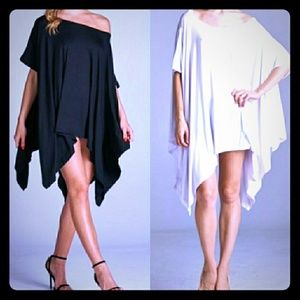 comfortable and chic top. Breezy and flowy. Looks great with skinny jeans or leggings.. can be worn on or off shoulders. Rayon 95% and spandex 5%. Black or white OSFM