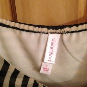 Spaghetti strap blouse. Black and white vertical stripes. Long body, but shorter than a tunic. Wear it under a blazer at work or with jeans and heels for dressy casual look.