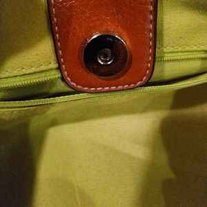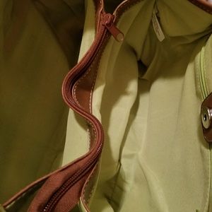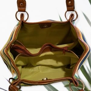 Stripped straw bag with braided long drop handles and snap closure. Inner bag is divided into two spaces with several pockets plenty of space for all your goodies! See pictures for measurements and good condition.