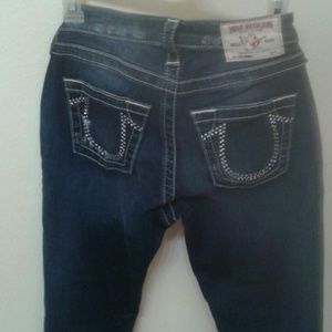 Rhinestone horseshoe true religion logo on back pockets dark blue wash high waist skinny jeans. New without tags.