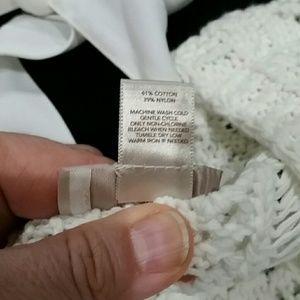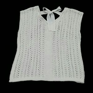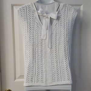 Summer Staple! Adorable sleeveless open knit sweater with a chiffon tie in the back. Cotton nylon blend.