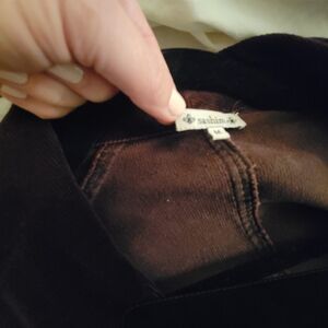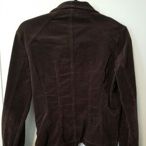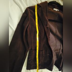 Casual, dark brown blazer. Fun with jeans. Slit at bottom of each sleeve, works well rolled/cuffed.