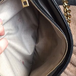 Gently used, some minor signs of wear on corners and scratching on front closure. A little bit of red lipgloss leaked in one pocket as shown