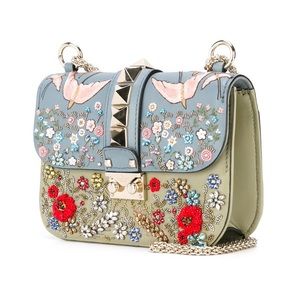 Multicoloured lambskin 'Glam Lock' embroidered shoulder bag from Valentino Garavani featuring a foldover top with push-lock closure, gold-tone Rockstud embellishments, a gold-tone chain shoulder strap, an internal zipped pocket and an internal logo patch.