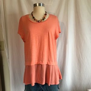 Orange t-shirt with extra matching material for a loose extra length. Heather style weave in t-shirt fabric and bottom is a tighter weave. 100% cotton and 100% rayon.
