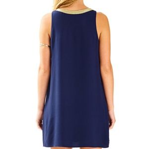 The Aubra Shift Dress is perfect when you want the glamour of a shift dress, but with a little ease and flow. You've got the hook-up: built-in lingerie snaps make this dress bra-friendly. Easy Shift With A Gold Embellished Notch Neckline on classy navy blue. 36.5" From Top Of Shoulder To Hem. Length: Above The Knee. Textured Rayon (100% Rayon).
